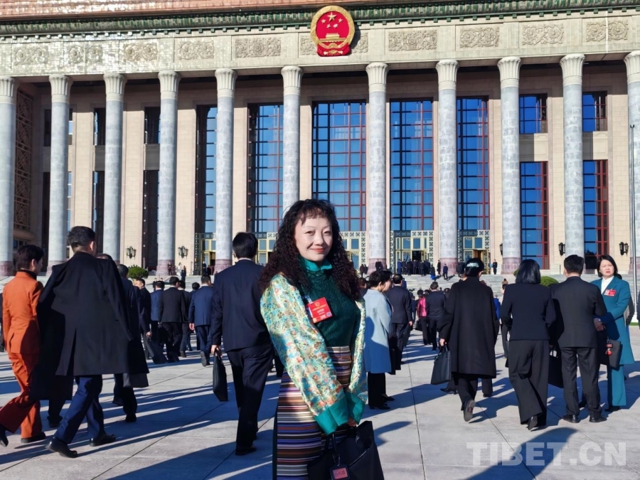 今年全國兩會期間,全國人大代表、西藏自治區(qū)社會科學(xué)院研究員白瑪措在人民大會堂前留影 受訪者供圖