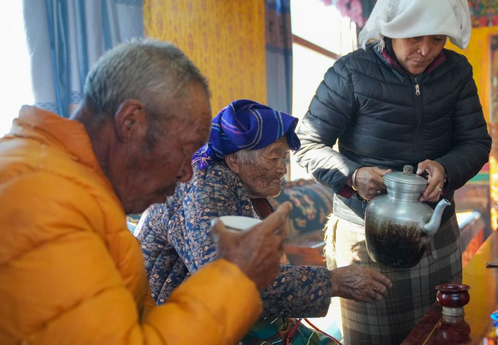 貢覺曲珍(中)和家人在家中喝酥油茶(3月6日攝)。