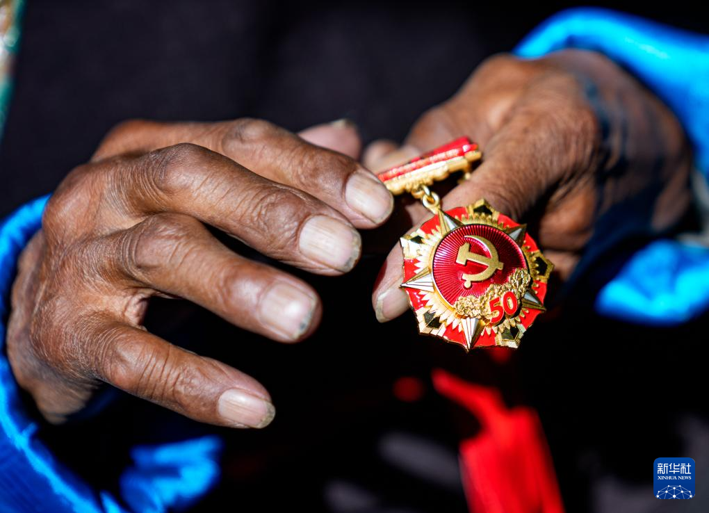 白瑪扎西在家中擦拭“光榮在黨50年”紀(jì)念章(3月26日攝)。