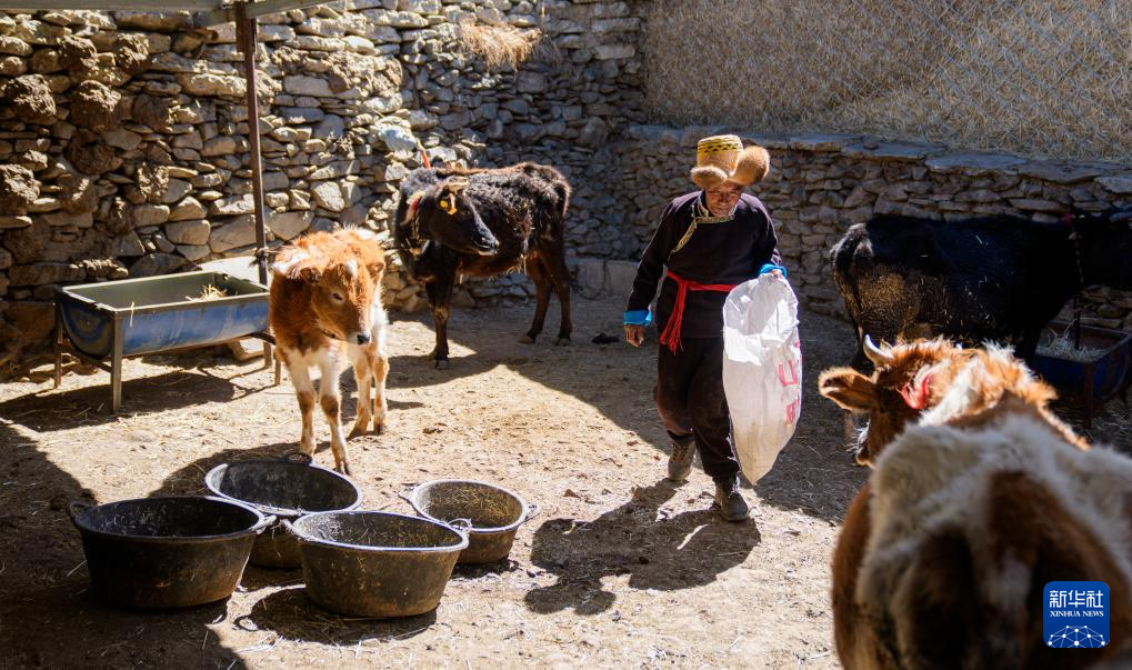 白瑪扎西在家中喂牛(3月26日攝)。