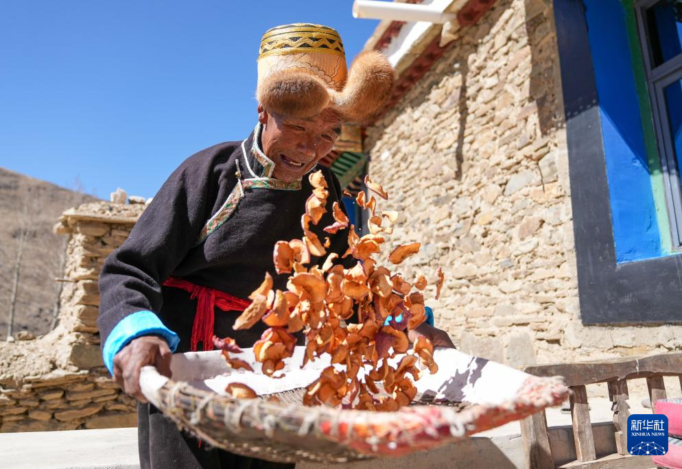 白瑪扎西在家中翻曬蘋果干(3月26日攝)。
