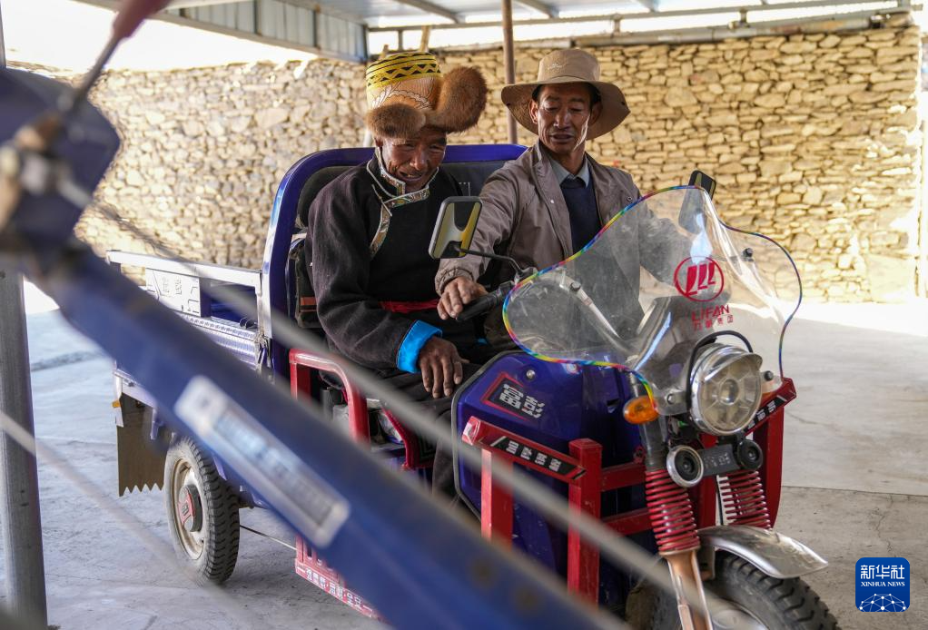 白瑪扎西(左)坐在女婿新買的電動三輪摩托車上(3月26日攝)。